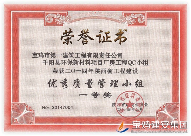 QC Team Award of Qianyang County Environmental Friendly New Materials Plant Project