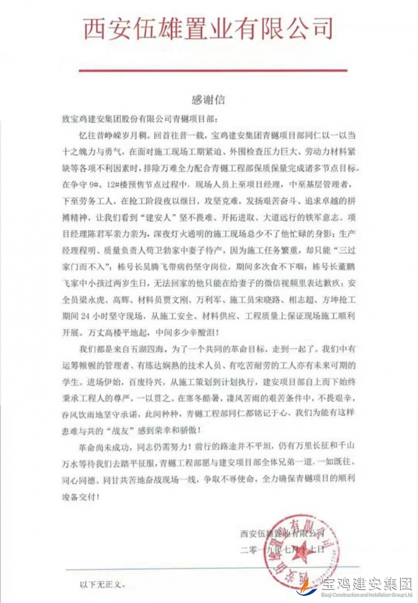 2019年7月17日,我公司路橋項目部承建的中南青樾項目收到由建設(shè)單位西安伍雄置業(yè)有限公司發(fā)出的一封感謝信,信中言辭懇切,對路橋公司青樾項目管理人員給出了極高的評價。在面對施工現(xiàn)場工期緊迫、資金短缺、外圍檢查壓力巨大、勞動力材料緊缺等各項不利因素時,寶雞建安集團(tuán)青樾項目部各位同仁克服自身困難、艱苦奮斗、不畏艱難以一當(dāng)十之魄力與勇氣保質(zhì)保量并按工期節(jié)點(diǎn)完成了施工任務(wù)。