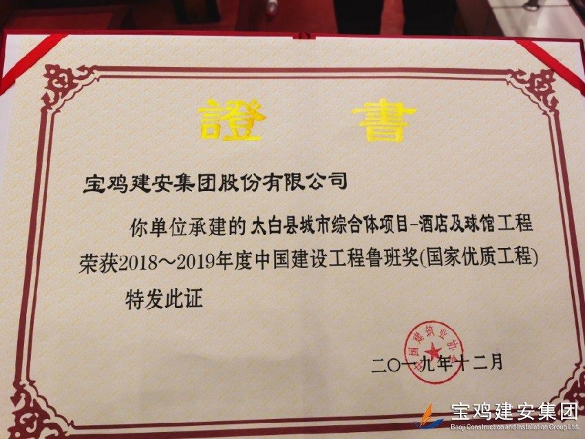 睽違三十載,喜開二度梅。12月10日,從北京會議中心傳來喜訊,由寶雞建安集團承建的太白縣城市綜合體項目—酒店及球館工程,在全國建筑行業(yè)精品工程最高獎項大比拼的激烈角逐中,力挫群雄,脫穎而出,最終摘得2018--2019年度中國建設工程魯班獎(國家優(yōu)質(zhì)工程)桂冠,這也使寶雞建安集團成為繼法門寺重建工程獲得寶雞第一個建筑魯班獎后,時隔近30年再次奪得“魯班獎”的企業(yè),從而書寫了建筑行業(yè)頂級獎“梅開二度”的傳奇!