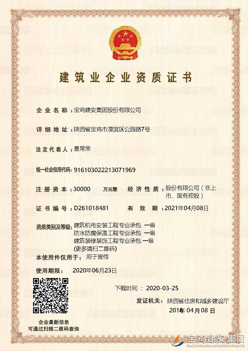 截止目前,公司具有建筑工程施工總承包一級資質;市政公用工程施工總承包一級資質;機電工程施工總承包一級資質;電力工程施工總承包二級資質;鋼結構工程、消防設施工程、環(huán)保工程專業(yè)承包一級資質;建筑裝修裝飾工程、起重設備安裝工程專業(yè)承包一級資質;建筑機電安裝工程、防水防腐保溫工程專業(yè)承包一級資質;建筑幕墻工程、地基基礎工程專業(yè)承包一級資質;古建筑工程專業(yè)承包二級資質等多項資質,促進了公司工程承攬格局持續(xù)優(yōu)化,資質體系不斷完善,為公司長遠發(fā)展打下了堅實基礎。