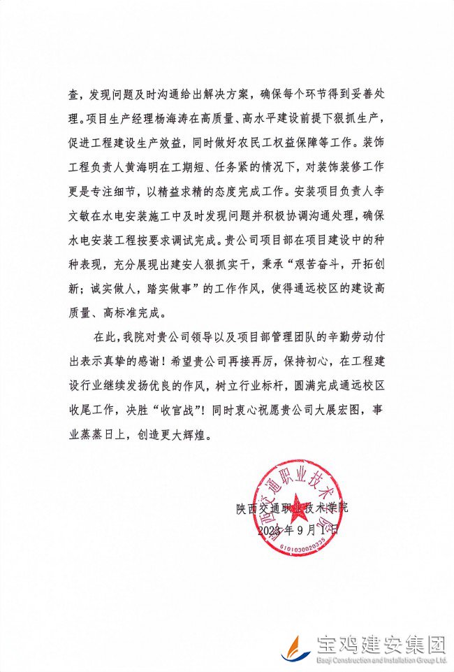 據(jù)悉,陜西交通職業(yè)技術(shù)學(xué)院新校區(qū)一期建設(shè)項目【EPC】一標(biāo)段建筑面積為48200.59平方米,工程造價3.4億。合同工期為2021年11月25日至2023年7月7日總工期600天,實際開工日期為2022年5月4日,經(jīng)過一年多的施工,現(xiàn)已完成教學(xué)樓和室外工程全部施工內(nèi)容,并于2023年9月1日正式投入使用。